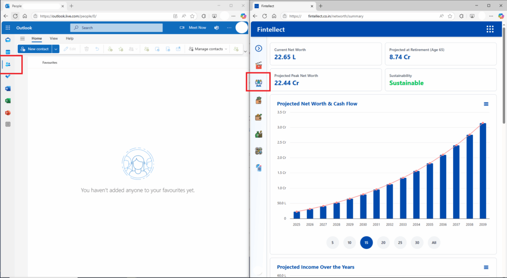 On the left-hand side of Outlook, the active app is visually highlighted, making it clear where you are. A tiny detail, but one that improves user experience. In Fintellect, the navigation icons weren’t doing this — until we noticed Microsoft’s approach. Now, our dev team is updating it so your current section (Net Worth, Investments, Goals, etc.) is always highlighted.